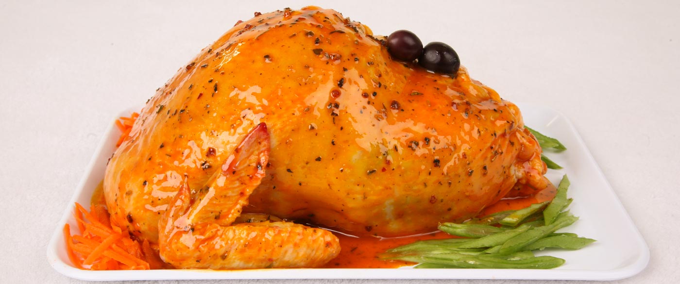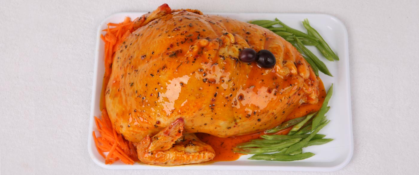 Frango Recheado com carne, especiarias, azeitonas e Temperado com temperos selecionados exclusivos, que conferem ao frango um sabor único.